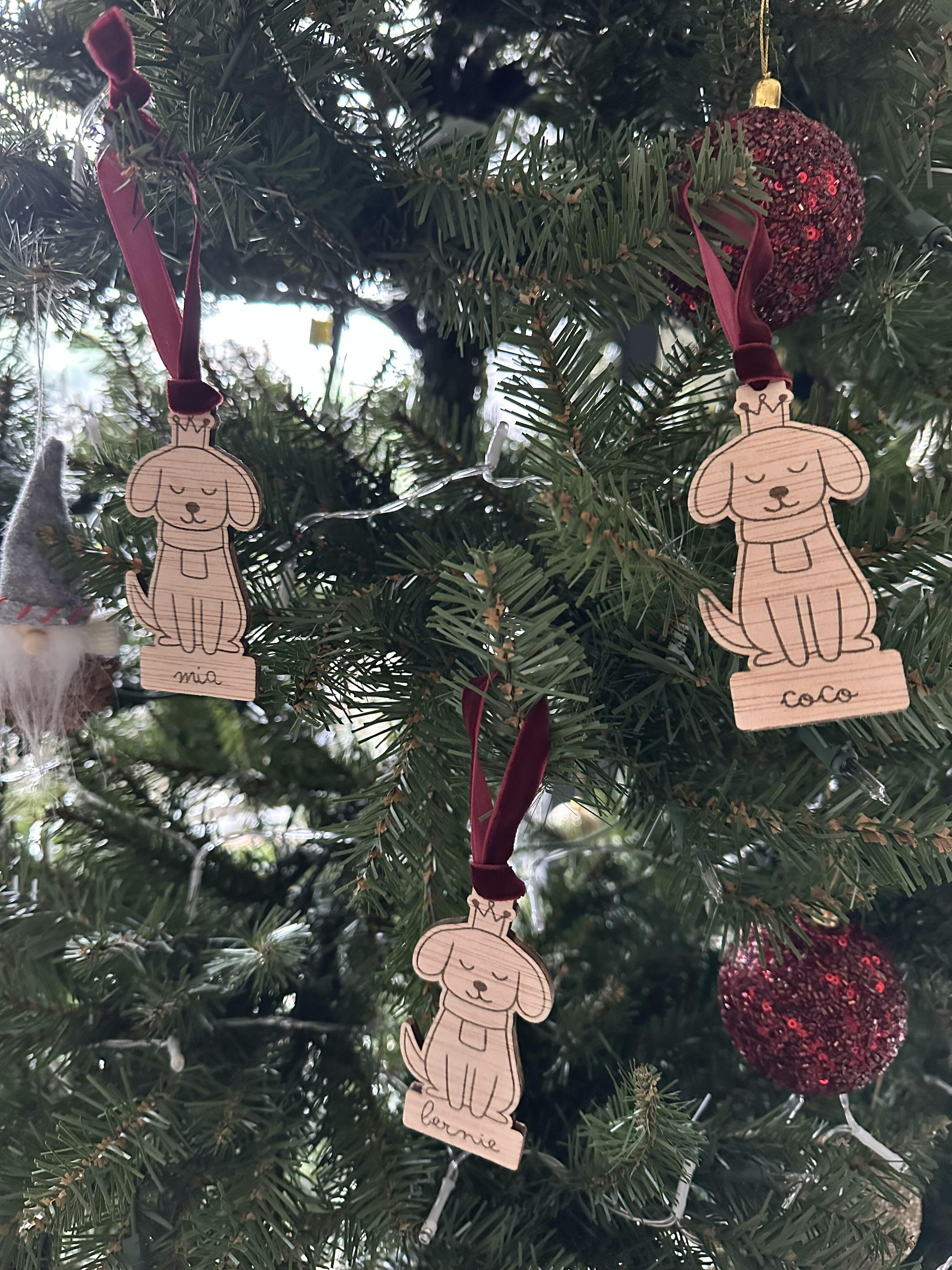 Don Perro es un adorno navideño de madera natural, con forma de perrito con bufanda, pensado para dar un toque cálido y personalizado a tu árbol de Navidad.